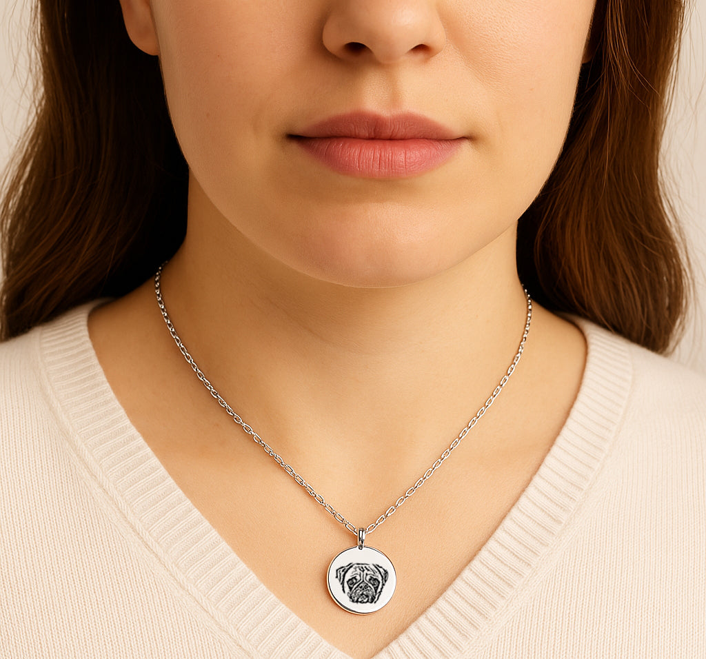 Unisex personalized memorial pet portrait necklace made of stainless steel. This necklace makes a great gift for pet lovers, new pet owners, dog moms and memorial gift. Send us two photos of your pet and we will create a detailed portrait.