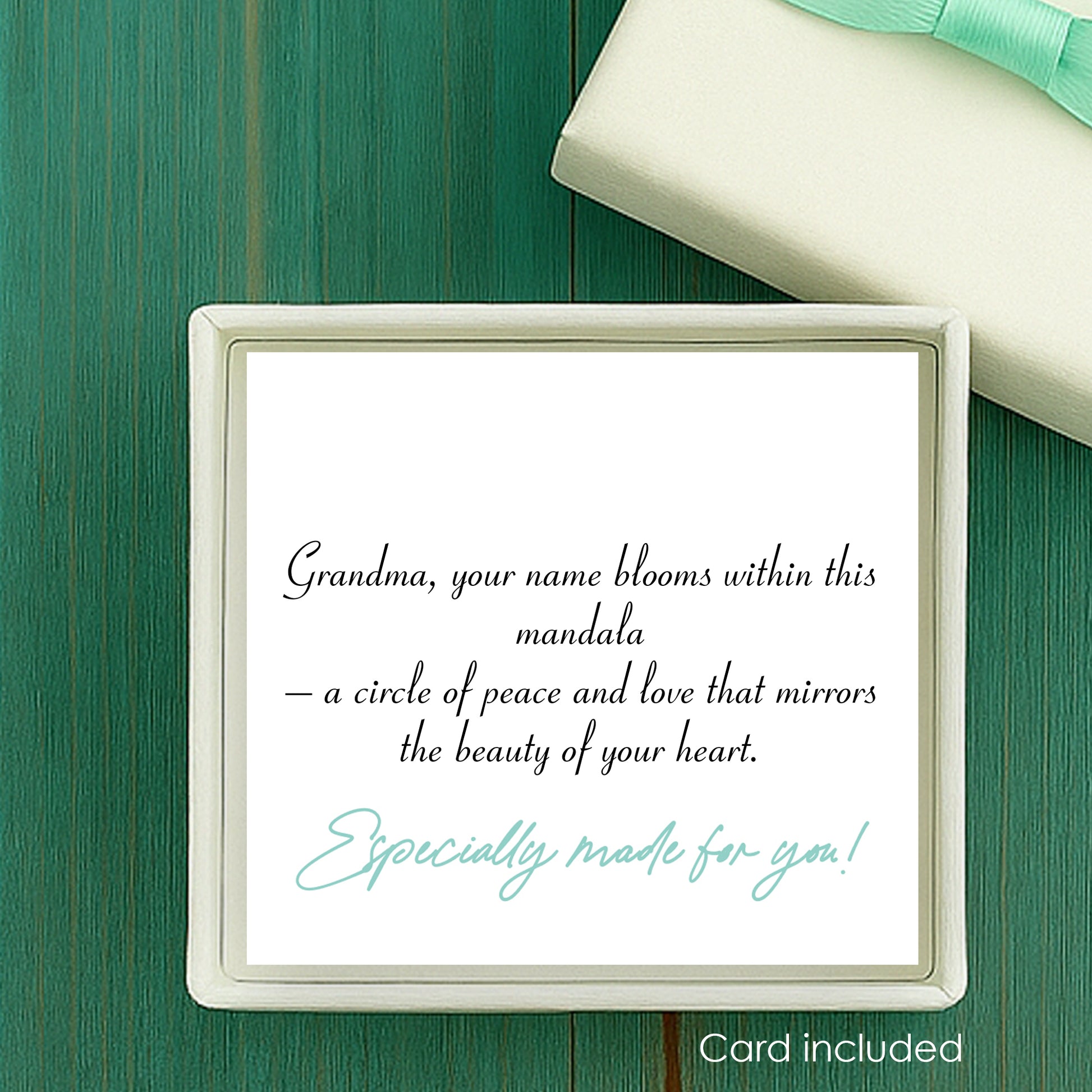 Personalized mandala necklace, for mom and grandma. This handcrafted necklace blends intricate mandala design with durable material to create a unique everyday accessory, choose from any of our six different designs all hand-drawn by us and add a short message on the back side of the necklace to create an unique gift for mom and grandma for their birthdays, Mothers day or Christmas.