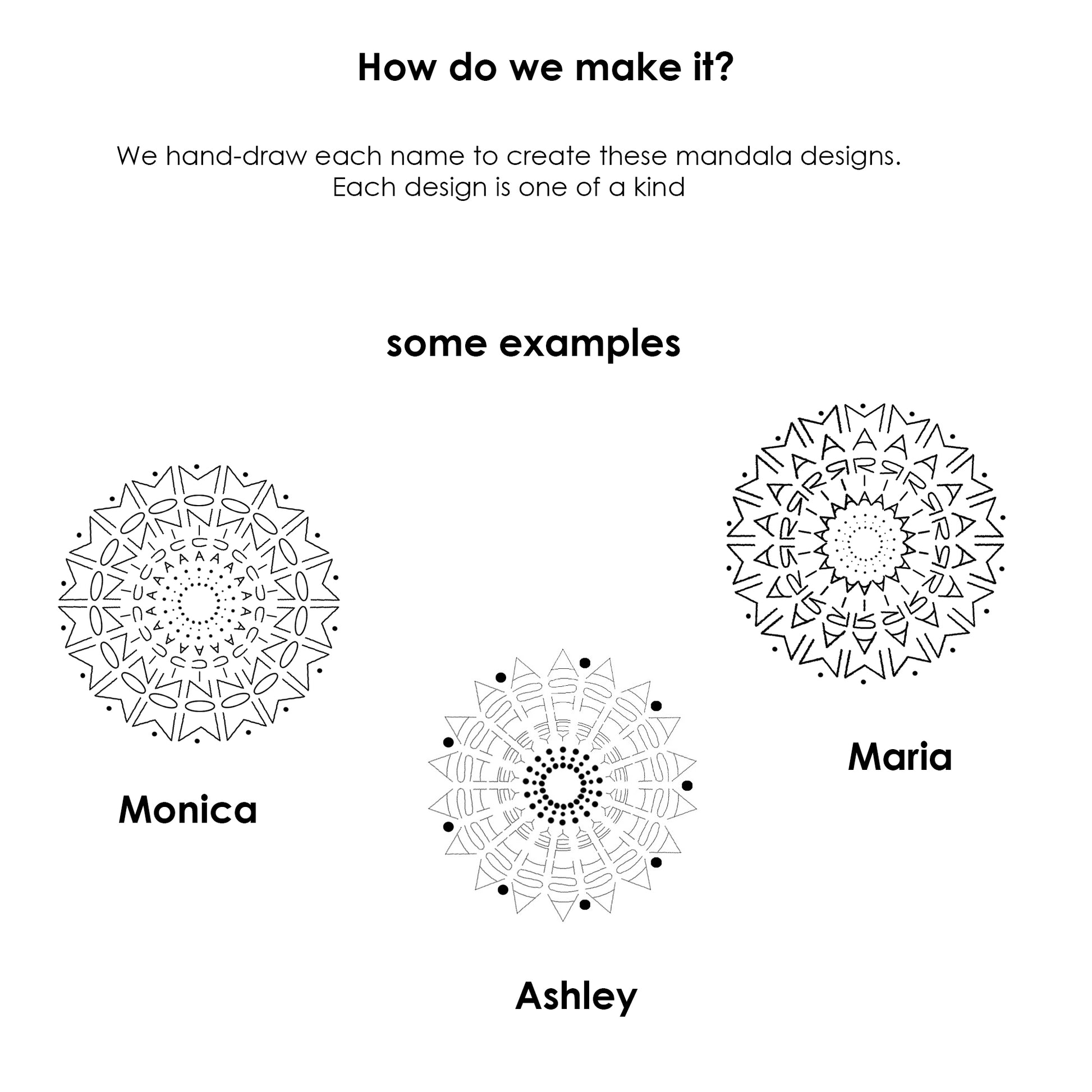 - Personalized mandala design made with your name or meaningful word (up to 6 characters)