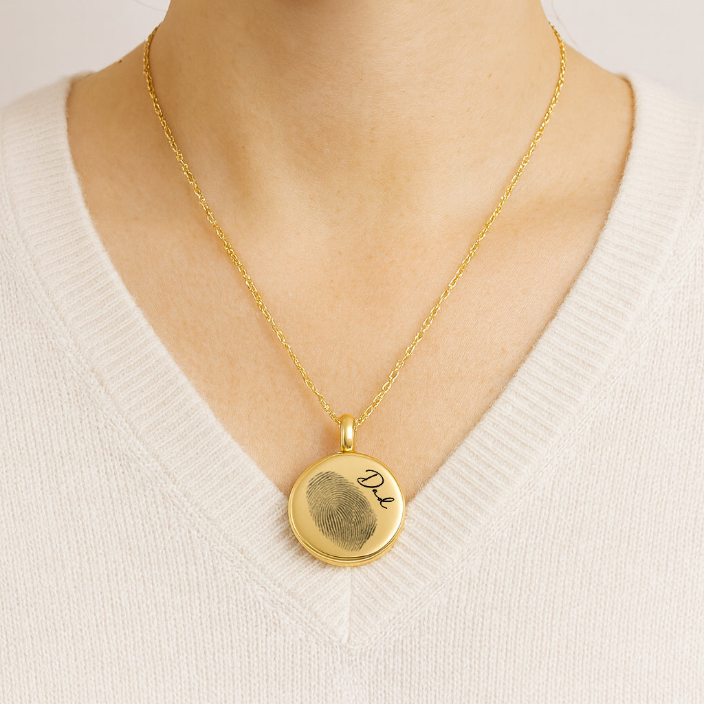 Unisex personalized locket necklace engraved with your loved one thumbprint, we handcraft each locket with attention to detail, using an image of your loved one thumbprint we replicate it and engrave it onto this sentimental keepsake, the results are very detailed images, you can see and feel the lines and texture of the prints.